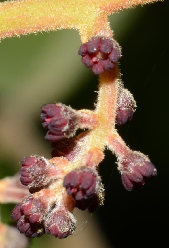 Tree up to ± 10 m. tall; trunk ± 6 dm. diam.; branches stout, bark nearly, black; branchlets, lflts, infl.-axes and capsules densely clad in ferruginous hairs when young. Lvs imparipinnate, ± 10–40 cm. long, on petioles ± 8 cm. long. Lflts alt. to subopp., 4–6 pairs on petiolules c. 5 mm. long. Lamina ± 5–10 × 2–5 cm. long, subcoriac., slightly obliquely ovate-lanceolate to ovate-oblong, acuminate, ± sinuate-undulate, coarsely irregularly serrate-dentate with teeth up to c. 5 mm. long, to obscurely toothed or entire. Panicles up to c. 3 dm. long, us. much and openly branched; pedicels slender, up to c. 5 mm. long. Calyx cupular, pubescent, ± deeply cleft into 5 triangular acute teeth. Stamens 6–8; anthers large, dark red. Ovary small, densely pubescent. Capsule somewhat woody, 8–12 mm. long, pubescent, winged above, the wing us. produced as a spur on one side. Seeds subglobose, black, lustrous; aril scarlet, fleshy, granular, us. investing lower half of seed, sts vestigial.