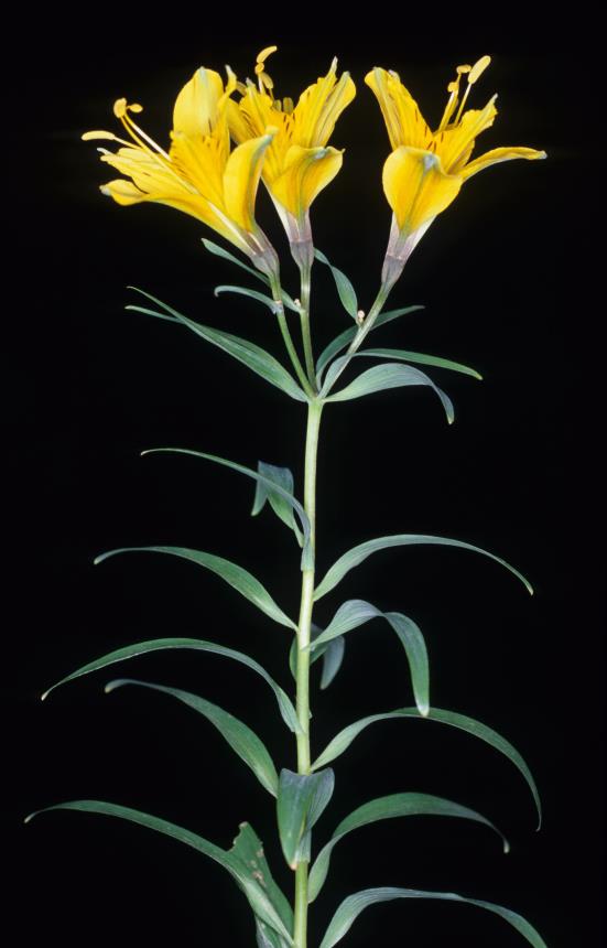 Erect perennial, to 1 m high. Rhizome slender, hard, woody, c. 5 mm diam., with some roots becoming fleshy. Stems purplish and sometimes woody below with short, acute, membranous bracts, green and leafy above. Leaves thin, ± glaucous below, c. 6–13 × 0.5–2 cm, narrow-linear to lanceolate to ± elliptic, many-nerved, midrip ± indistinct, petiole short, narrow, twisted, with short sheath. Umbel compound, with 3–6 primary rays c. 5 cm long, each ultimate branch bearing 1–3 flowers, bases of primary and secondary rays with bract-like leaves similar to, and not much shorter or narrower than foliage leaves. Flowers c. 5 cm long, 1.5–3 cm diam., bright yellow with reddish markings; segments free, clawed, outer oblong, reddish-tinged towards green obtuse tip, inner slightly longer and much narrower than outer, acute, 2 upper with red-purple streaks. Capsule c. 2 × 1.5 cm, longitudinally 6-ribbed, with smooth apiculate cap.