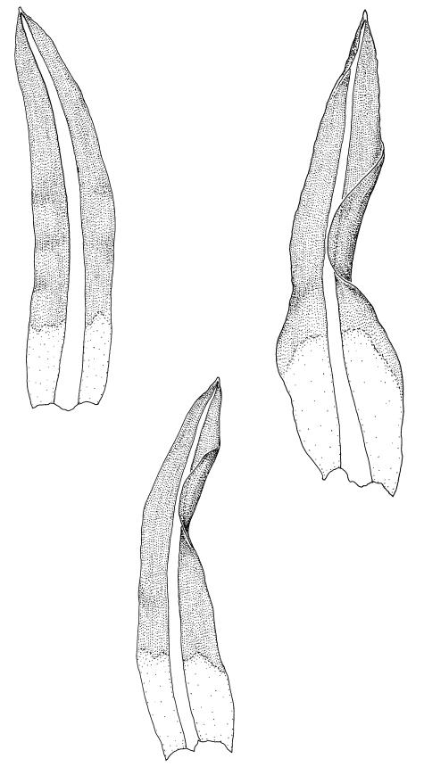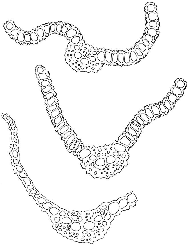 The Central American species Bryoerythrophyllum jamesonii (Taylor) Crum has been recorded for N.Z. (e.g., Ratkowsky 1980; Fife 1995; Beever et al. 1992). Comparison with type material of B. jamesonii (Ecuador, Pichincha, W. Jameson s.n. HUH 00258057) shows that N.Z. specimens (including the type of Trichostomum binnsii R.Br.bis) differ in their leaves having fewer marginal teeth (which are confined to near the leaf apex), a conspicuous area of smooth, thin-walled, hyaline cells adjacent to the costa in the leaf base, and the abaxial surface of the costa finely and densely papillose in at least its distal third. N.Z. specimens previously so named are now referred to B. dubium.