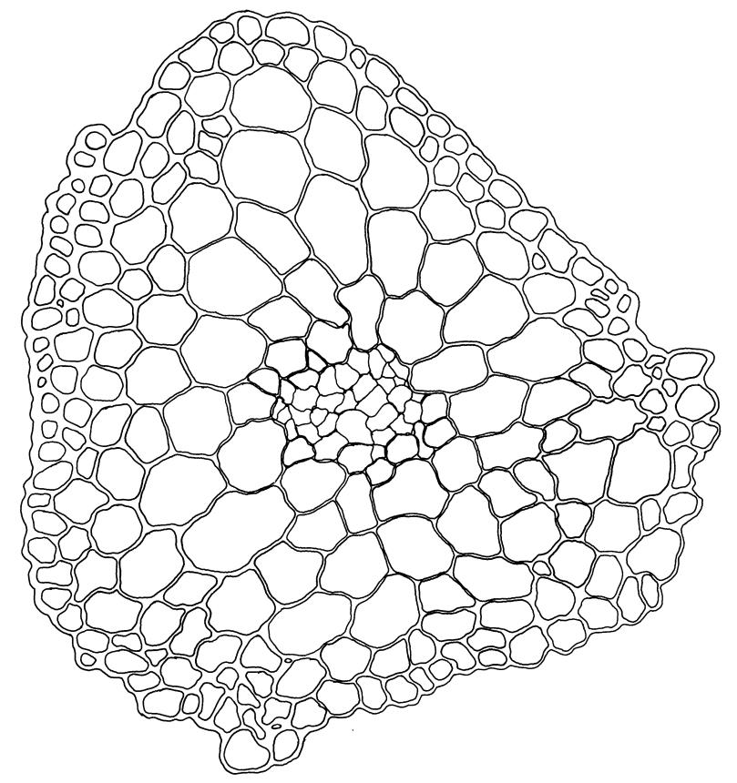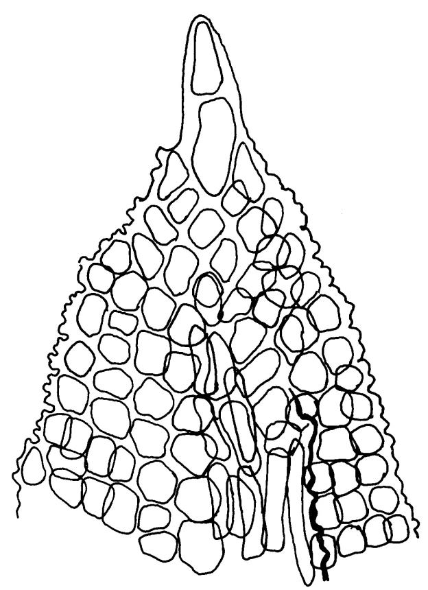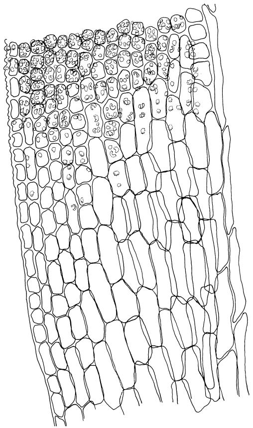 Plants yellow-green above, brick-red below, forming dense tufts. Stems 5–20 mm, central strand present, sclerodermis weakly developed. Leaves spreading when moist, incurved and weakly twisted around stem when dry, 1.0–1.5 mm, lingulate, carinate, acute with a hyaline apiculus; margins recurved below or plane throughout, crenulate-papillose, and occasionally irregularly dentate at the apex; upper laminal cells obscure, subquadrate, firm-walled, pluripapillose with c. 4–6 complex papillae, (6.0–)7.0–12.0(–13.5) × 7.0–9.0(–10.0) µm, becoming longer and with uniseriate, simple papillae towards the leaf base; upper marginal cells ± oblate in 1–2 rows; lower laminal cells conspicuously differentiated, gradually transitioning from upper laminal cells, hyaline, rectangular to long-hexagonal, lax and thin-walled, smooth, with c. 4 rows narrower and firm-walled forming a weak border. Costa stout, failing a few cells below the apex or percurrent; adaxial superficial cells at mid leaf elongate and thick-walled; abaxial superficial cells at mid leaf fusiform to rectangular, papillose; in cross-section with stereids exposed on both faces at mid leaf. Laminal KOH colour reaction orange-red to red.