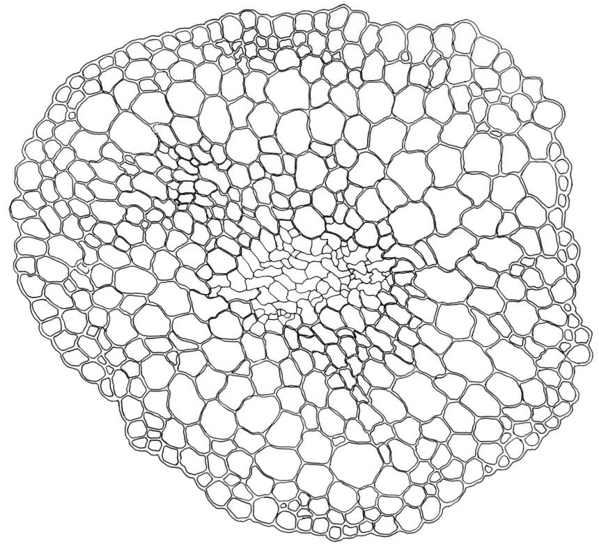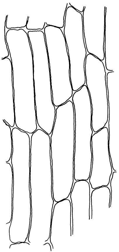 Plants yellow-green above, red-brown below, forming dense tufts. Stems 10–15 mm, sparsely tomentose below, central strand present, sclerodermis weakly developed. Leaves erect-spreading from a ± sheathing base when moist, flexuose and individually twisted when dry, 2–3 mm, linear-lanceolate from a broader base, carinate, narrowly acute, sometimes with a hyaline apiculus; margins recurved, crenulate-papillose, often irregularly denticulate at the apex; upper laminal cells obscure, subquadrate, firm-walled, pluripapillose with complex papillae, (7.5–)10.0–12.0(–14.0) × (7.5–)9.0–10.0(–11.0) µm, becoming longer towards the leaf base; upper marginal cells ± oblate in 1 or 2 rows; lower laminal cells conspicuously but gradually differentiated from upper laminal cells, hyaline, rectangular to long-hexagonal, lax and thin-walled, smooth, with c. 5 rows at the margin narrower and firm-walled, forming a weak border. Costa stout, percurrent, at mid leaf with stereids exposed on abaxial face only; adaxial superficial cells as adjacent laminal cells; abaxial superficial cells at mid leaf fusiform, thick-walled and papillose. Laminal KOH colour reaction orange-red to red.