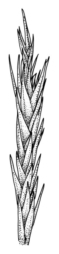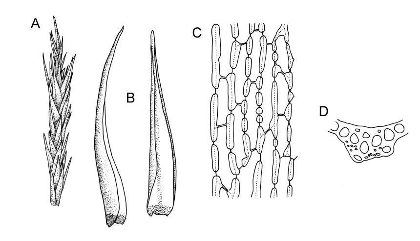 Sainsbury (1955, p. 123) recorded D. scoparium from the Rock & Pillar Ra. (Otago L.D.), based on material collected by K.W. Allison; he reported this material as a "variety or form" of D. scoparium [D. scoparium var. orthophyllum Brid., Muscol. Recent. Suppl. 1: 173, 1806]. Although the name D. scoparium has been applied to Otago L.D. material since Sainsbury’s report (e.g., Fife 1995 and various workers in herb.), its application here is misleading. The Otago high-elevation material invariably has erect-appressed ovate-lanceolate leaves that are entire or nearly so, and with costae lacking both abaxial spines and ridges. Representative D. scoparium from the northern hemisphere has mostly secund and strongly serrate leaves with costae markedly ridged abaxially. On morphological grounds the Otago material is most similar to Dicranum leioneuron Kindb., a species with a Nova Scotian type. Smith (2004) considered it in Britain to be an occupant of "Sphagnum tussocks on raised and blanket bogs and in drier habitats under heather and in thin turf over boulders". Otago material compares very well morphologically to descriptions in Smith (2004) and in Ireland (1982), as well as to Newfoundland material. Our material occupies boggy sites not unlike those described for Europe.