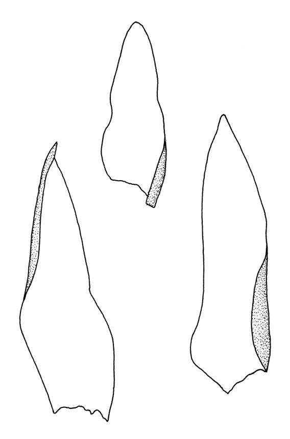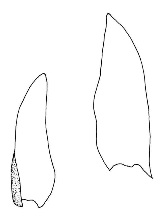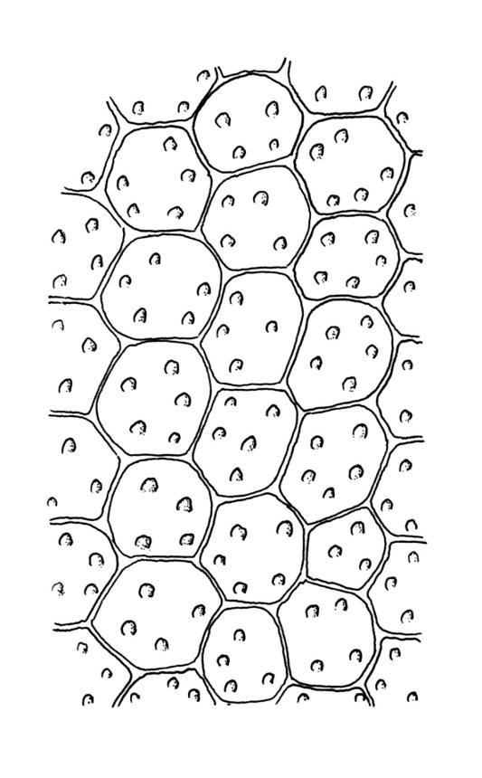 Plants pale grey- or blue-green, glaucous, forming loosely interwoven mats on bark; shoots c. 4–7 × c. 0.5 mm, with ± complanate, lateral branches of unequal length. Stems creeping, irregularly branched, fragile, sparsely beset with long, smooth, and red-brown rhizoids that arise in fascicles on the lower surface, in cross-section with 2 layers of incrassate cells surrounding c. 6 inner parenchyma cell layers. Branches simple or forked, mostly c. 2(–3) mm long. Stem and branch leaves similar, ecostate, in four ranks and ± complanate; leaves of the two dorsal ranks loosely spreading, asymmetrically ovate and acute to apiculate apically, mostly 0.4–0.6 × 0.2 mm, crenulate at margins due to strongly bulging cells, inrolled on lower margin, the apiculate apex often pale; leaves of the ventral ranks shorter and narrower. Upper lamina cells ± isodiametric-hexagonal, thin-walled, strongly bulging, non-collenchymatous, mostly 9–15 µm diam., with several (c. 4–9) flat-topped papillae on each surface; apical cells often pale and opaque, papillose and mostly c. 21–30 µm long; cells of lower lamina and lower margins weakly oblate but otherwise similar to those above; basal and alar cells not differentiated.