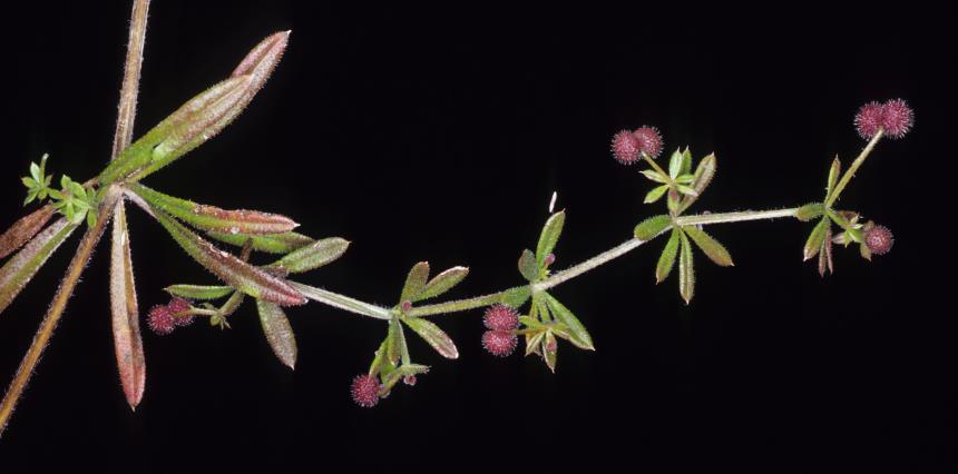 Prostrate or scrambling annual; stems to 2 m long when through other vegetation, rather stout, branched, densely clothed in retrorse, hooked, scabrid hairs on the sharply acute angles. Lvs and stipules in whorls of 5–8, sessile, 10–60 × 2–8 mm (sometimes smaller on exposed prostrate shoots), linear-oblanceolate or narrow-elliptic, often spathulate or obovate on exposed lateral shoots; margins flat or nearly so, densely clothed in retrorse, hooked, scabrid hairs; midrib below and surface generally above ± scabrid; apex shortly awned. Fls (1)–2–(6), in axillary divaricating cymes; peduncles usually > pedicels; whorl of bracts at base of pedicels leaflike and scabrid. Corolla 1–2 mm diam., white or whitish; lobes ovate, ± mucronate. Mericarps 2.5–4 mm diam. (excluding bristles), globose or subglobose (often 1 of the pair smaller or abortive), densely furnished with hooked bristles.