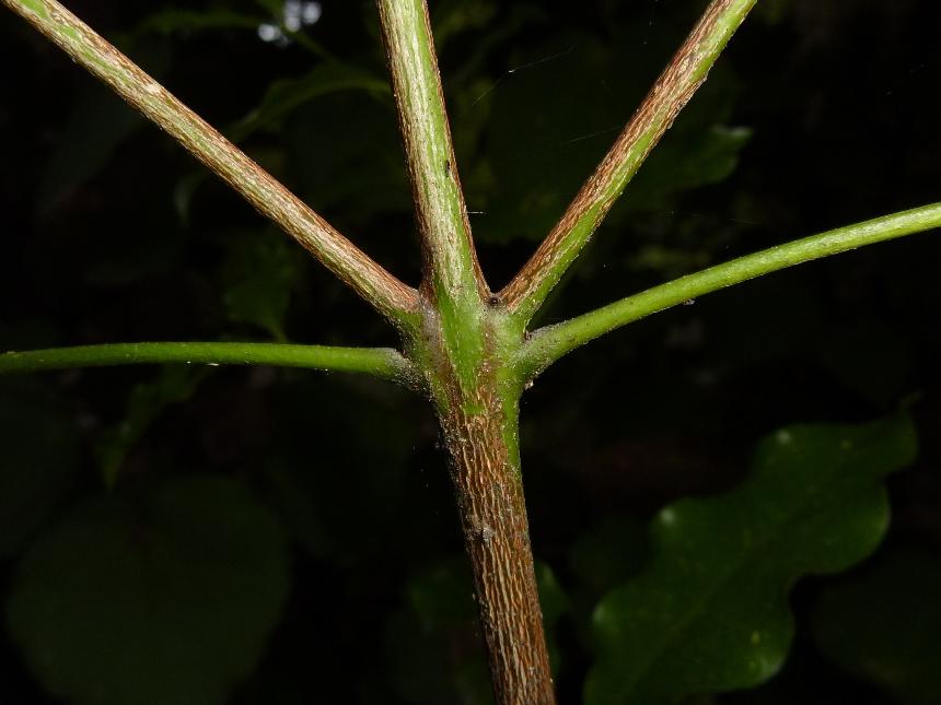 Glab. much-branched spreading shrub up to 6 m. tall; branchlets slender, pale yellow-green when young. Lvs opp., 3-foliolate, on petioles up to c. 5 cm. long; petiolules very short to 5 mm. long. Lamina thinly coriac., (5)–7–10 × (2)–3–4 cm., subacute to acute, obovate-cuneate to elliptic- to ovate- or obovate-oblong, entire (all forms may be on same plant). Subfloral lvs may be 2- to 1-foliolate. Infl. of often paired axillary cymes, ± trichotomously branched, on peduncles ± 2 cm. long; bracts minute, ovate; pedicels ± 5 mm. long. Fls perfect or unisexual, 8–10 mm. diam. Sepals ovate-oblong, c. 1·5 mm. long, gland-dotted; petals greenish, ovate-oblong, concavo-convex, c. 5 mm. long, gland-dotted. Ovary glab., style short, stout. Disk annular, lobulate.. Cocci ± 5 mm. long, pale brown, wrinkled and punctulose. Seed ± 5 mm. long, black, glossy.