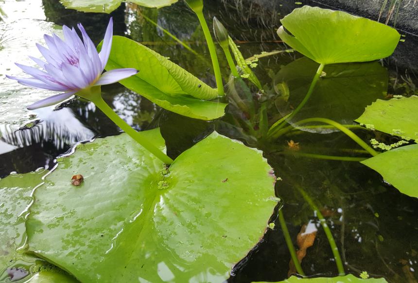 The striking anther appendages in Nymphaea capensis are blue, pink or mauve (the same colour as the tepals) and are characteristic of species from Nymphaea subgenus Brachyceras, although in some Central and South American species (and a few African species) they are white. Many hybrid cultivars involving species from this subgenus are also present in New Zealand (Champion & Clayton 2001).