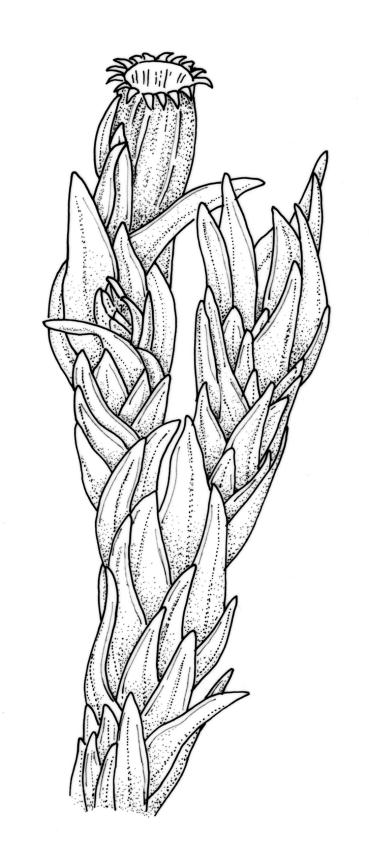 Plants mostly 12–20 mm, occasionally shorter, forming loose tufts or cushions, green, blue-green, olive-green or brown above, brown-black below. Stems moderately branched by innovation, with rhizoids variably developed. Leaves erect-appressed and sometimes slightly contorted when dry, spreading when moist, ± glaucous, lanceolate to ovate-lanceolate, acute, entire (or slightly dentate near apex when young), sometimes decurrent, narrowly or broadly recurved on one or both sides, (2.0–)2.3–3.2 × 0.5–0.8(–1.0) mm (including perichaetial); upper laminal cells thin- or thick-walled, isodiametric or nearly so, (5–)8–13 × 8–13 µm, with 2–3 low and usually unbranched papillae per cell; basal laminal cells rectangular or almost quadrangular, (19–)32–64 × 9.5–16 µm, thin-walled, lacking pores. Costa as per genus. Gemmae absent.