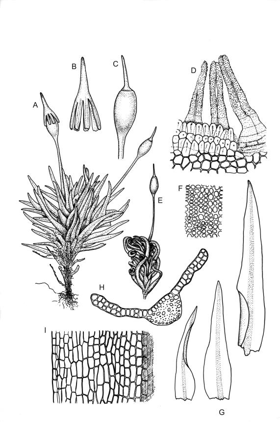 Plants forming cushions or low turves on rock, dark green or yellow-green above, brown or nearly black below. Stems c. 5–7 mm, usually branched by forking, in cross-section with a central strand, beset below with smooth brown rhizoids. Leaves ovate-lanceolate, entire, acute or rounded and sometimes ± cucullate at apex, concave and U-shaped in section, not plicate, c. 2–3.5 mm, becoming gradually larger towards stem apex; margins plane, bistratose; mid laminal cells mostly shorter than wide, oblate-elliptic, firm-walled, smooth, c. 6 × 9–12 µm, bistratose in large patches, usually becoming predominantly or wholly bistratose (visible under compound microscope in surface view or in cross-section) in the upper lamina (c. 1 mm from the apex) but occasionally with bistratose areas largely confined to the margins; basal cells oblong-rectangular, thinner-walled, and weakly inflated; alar cells not differentiated. Costa subpercurrent, occupying c. ⅙ the width of the leaf base, often lustrous abaxially when dry, in cross-section bulging on the adaxial surface (inadequately illustrated here), with median guide cells and two stereid bands, the adaxial cell layer approximately the size of adjacent laminal cells.