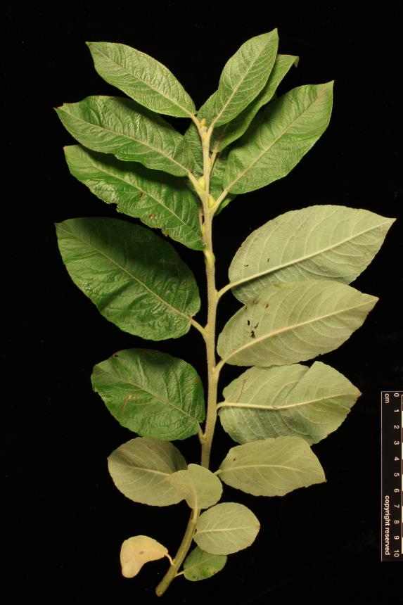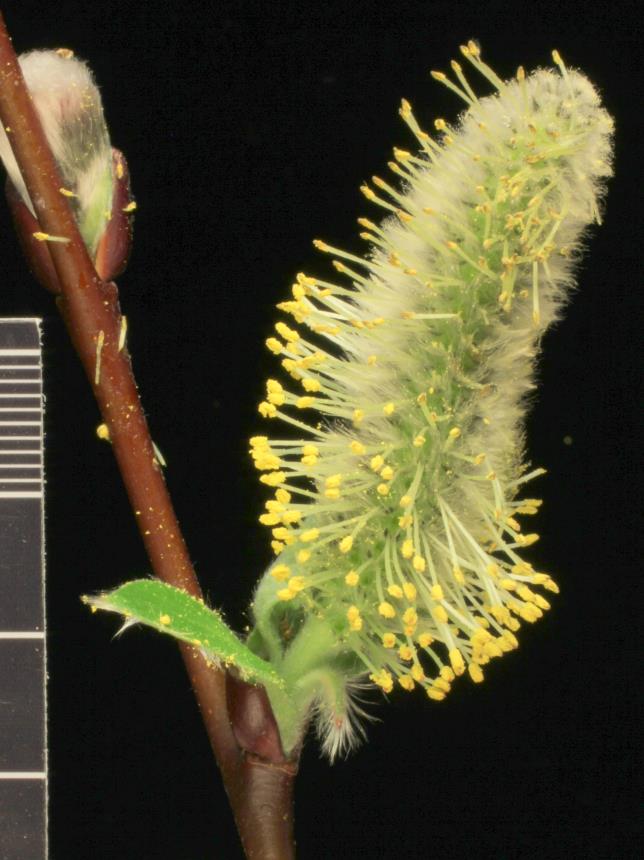 Wood ridges absent. Current year's branchlets green, densely velvety. Year-old branchlets greyish red to red-brown (UCL19–43), very sparsely tomentose, 3.4–3.5 mm diameter. Bud scales 8.8–11.7 mm long, 3.5–5.5 mm wide, 3.0–3.5 mm deep, ovoid, with slight angles, dark red to red-brown (UCL16–43), glabrous to very sparse long-silky hairy. Stipule absent from spring leaves, up to 18 mm long in summer leaves, not persisting. Petiole 12–17 mm long, pale yellow, densely tomentose, glands absent, base of petiole not enlarged. Emerging leaves green, with dense tomentum. Proximal leaves entire. Leaf lamina 95–104 mm long, 48–60 mm wide, length to width ratio 1.7–2.1:1, ovate; base cordate to truncate; apex acute or acuminate; leaf galls absent; margins crenate, finely revolute; upper lamina surface slightly bullate due to impressed veins, dull to medium glossy, sparsely tomentose, tomentum dense on midvein, stomata absent; lower lamina surface midvein and side-veins raised, distinctly glaucous, densely tomentose. Catkins emerging before leaves. Flowering branch 49–53 mm long, 3–4 reduced leaves + 1–2 cataphylls. Male catkin 34–42 mm long, 19–23 mm diameter; catkin rachis not visible between flowers. Flower bract 2.4–2.8 mm long, 1.0–1.3 mm wide, red on emergence; apex turning black, hyaline below, flat; apex acute to obtuse, moderately dense long-silky hairs on surfaces and margins. Male nectary 1, 0.8 mm long, 0.4–0.6 mm wide, green. Stamens 2, filaments free, hairs absent; anthers 1.4–1.6 mm long, yellow, red at apex only.