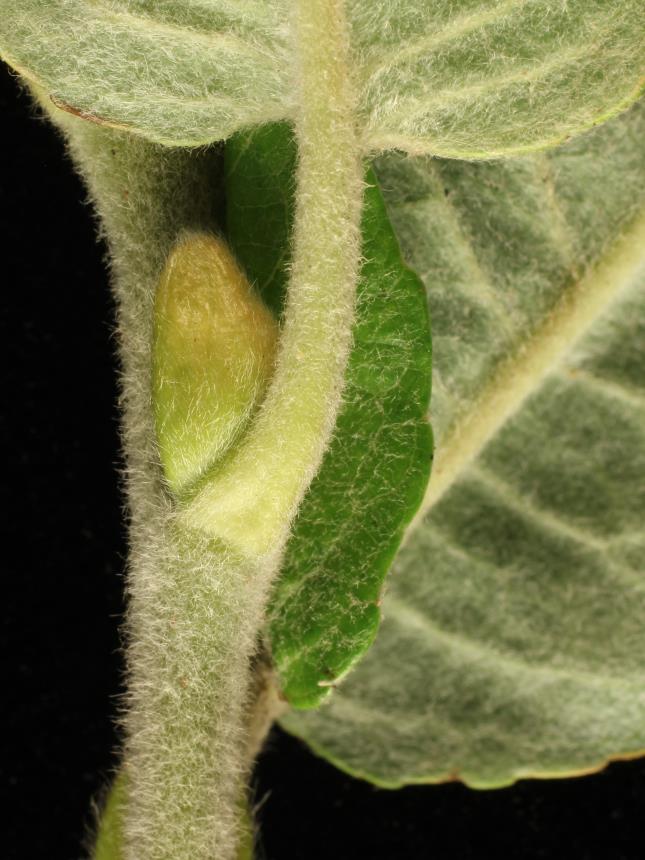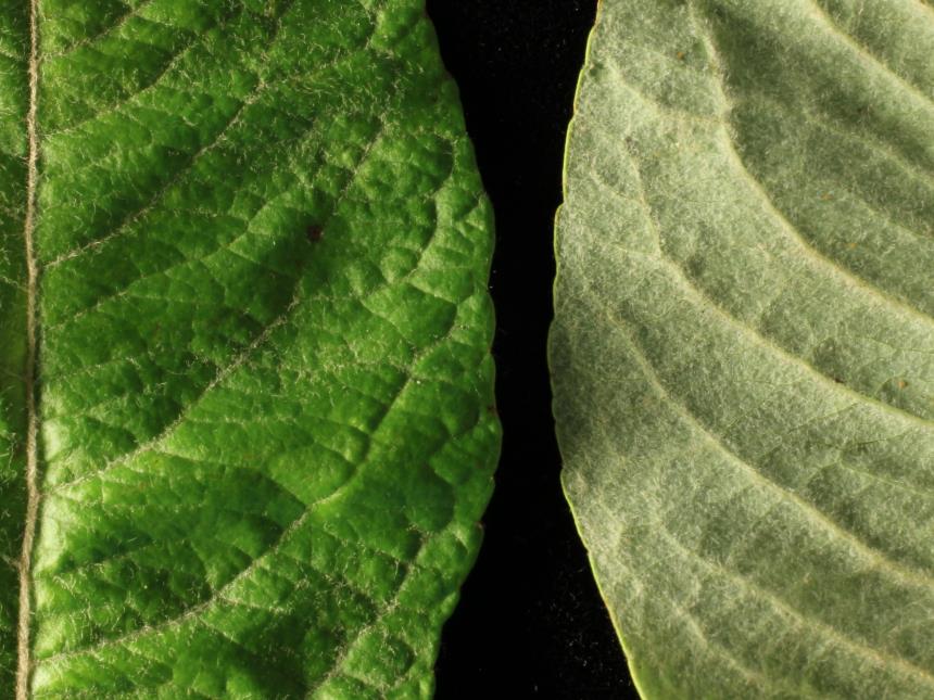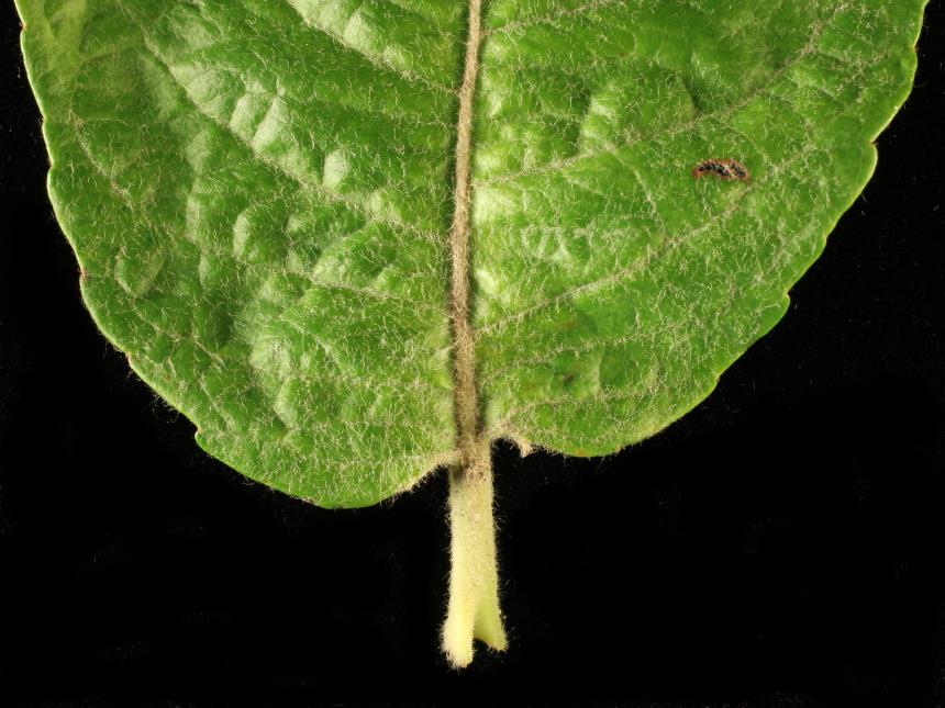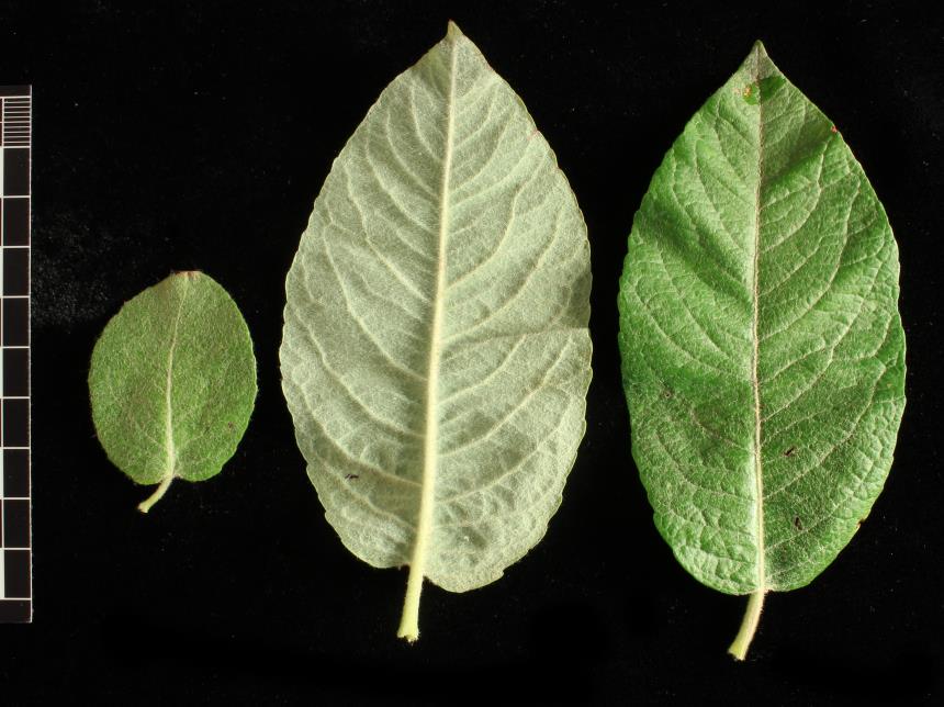 The leaf lamina is large (95–104 × 48–60 mm) and ovate, on a petiole 12–17 mm long, the lamina base is cordate, the margins finely revolute and crenate but untoothed. The lower leaf surface is densely and persistently tomentose. Stipules do not persist and appear to be absent from spring leaf growth. Current year's branchlets are densely velvety, the hairs not persisting. Salix hookeriana in its native range appears to be variable in shape at the leaf base, but both clones in New Zealand have a distinctly cordate leaf base. The type does not have this feature, but it can be seen in some herbarium specimens of S. hookeriana from North America.