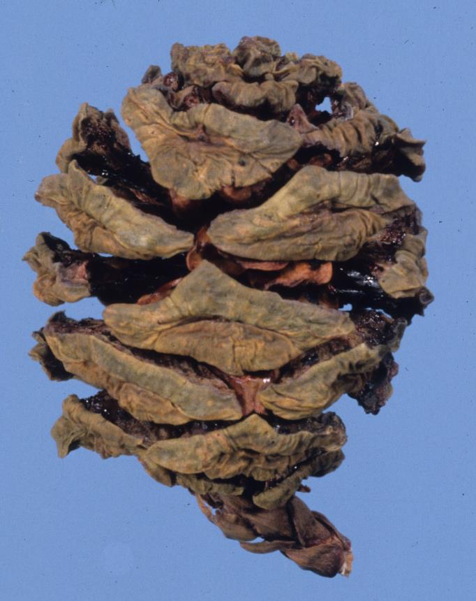 Large or very large tree. Bark reddish brown, shedding in large plates. Shoots green for 2–3 years. Lvs of lateral shoots 1.2–2.6 cm × 1.3–3 mm (earliest and latest-formed lvs usually smaller), linear to linear-oblong; stomatal bands white, broad, almost extending to midrib; apex sharply mucronate, mainly acute on cone-bearing shoots. ♂ strobili 3–4 mm diam. ♀ cones 2–2.5 cm diam., often pendulous. Disc (scale umbo) prominently ridged and wrinkled; mucro very small. Seed 5–6 mm long, elliptic to ± oblong.