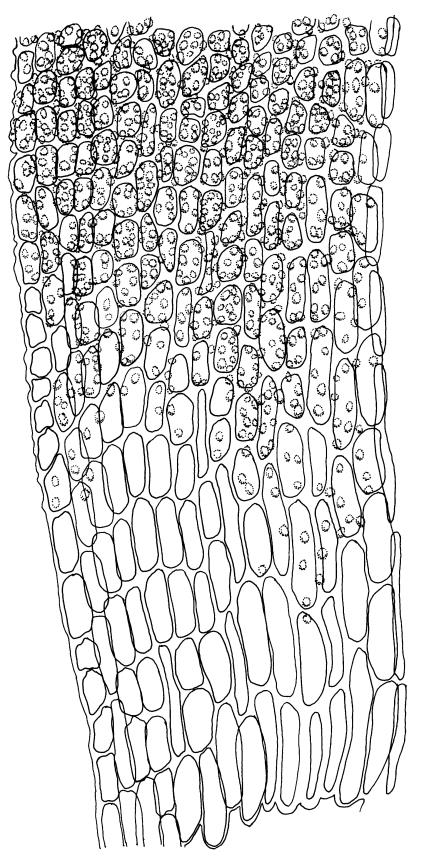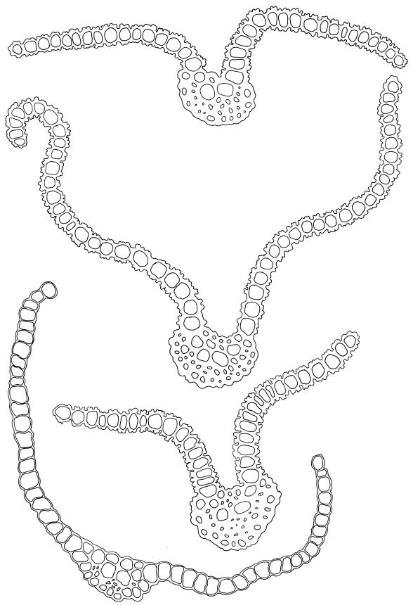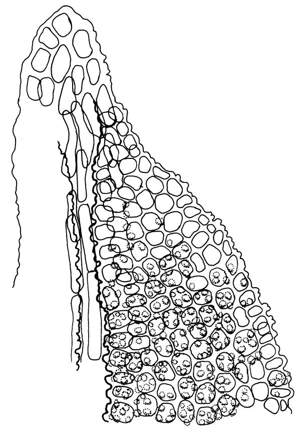 Plants bright yellow-green above, brown below, forming tufts or turves, usually on soil. Stems 3–10 mm, in cross-section with a central strand, a weakly developed sclerodermis, and with the outermost walls of the surface cells thin. Leaves erect-spreading to spreading when moist, incurved, or individually twisted, and often weakly twisted around the stem when dry, 1.0–1.7 mm, oblong-lanceolate, carinate, acute, often with a conspicuous unicellular, hyaline apiculus (not illustrated); margins variably recurved in basal half, plane and often undulate above, crenulate-papillose; upper laminal cells obscure, quadrate to round-rhombic, some oblate, firm-walled, evenly thickened, pluripapillose with complex papillae, (6.0–) 9–10.5 × 7.5–9.0 µm; upper marginal cells mostly shorter in one row; lower laminal cells gradually transitioning from upper laminal cells, extending higher medially, rectangular, thick-walled, with scattered simple papillae, smooth in the extreme base, and one row shorter at the margin, forming a weak border. Costa failing 1–3 cells below the leaf apex or percurrent, sunken in a deep groove adaxially; adaxial superficial cells long-rectangular, ± smooth; abaxial superficial cells elongate and papillose in distal ⅔ of leaf. Rhizoidal tubers often present, sub-spherical to ellipsoid-pyriform, (70–)100–120(–150) µm long, brown with internal walls thin and dark red, non-protuberant surface cells. Laminal KOH colour reaction yellow.