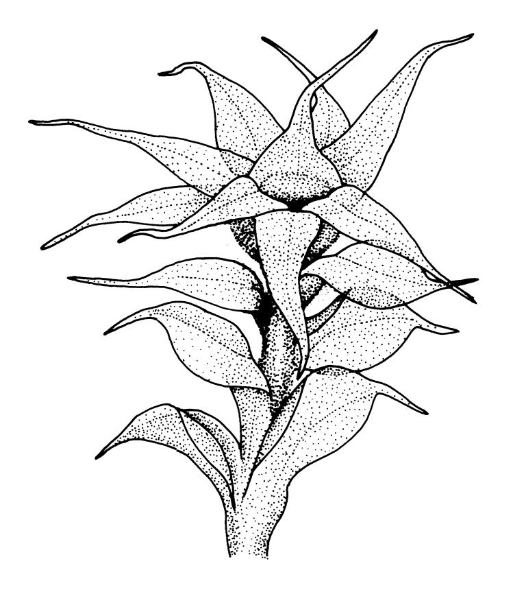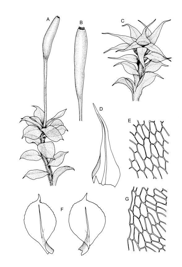 Plants variable in size, bright green to bright red-purple. Stems unbranched, typically 15–30 μm, beset with red-brown, smooth rhizoids. Leaves erect- to wide-spreading and nearly plane when moist, more erect and crisped when dry, becoming ± larger toward stem apex, broadly obovate, rather abruptly tapered to a reflexed or squarrose apiculus (0.5–0.9 mm long in well-developed leaves), plane or weakly recurved at margins, entire or weakly and obtusely toothed above, (2.3–)2.5–3.3 × (1.0–)1.5–2.0(–2.5) mm (exclusive of apiculus; leaves of male plants usually narrower than those of female plants); upper laminal cells thin-walled, weakly porose, oblong-hexagonal, in upper third c. (60–)75–105 μm, often becoming shorter towards the margins, arranged in ill-defined diagonal files, becoming longer and more oblong below. Costa rather ill-defined and stout, c. 100 μm wide at ⅓ above leaf base, dilated below, usually ending below the base of the apiculus. Axillary hairs inconspicuous.
