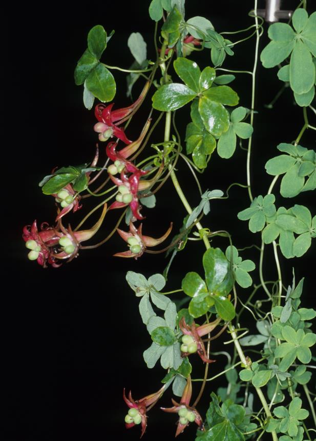 Glabrous or glabrate perennial with thick rootstock and slender stems, sometimes high climbing by means of slender coiling petioles to 7 cm long. Lvs digitate; leaflets 5, sessile or subsessile. Lamina of terminal leaflet (1)–1.5–3.5 × 0.75–1.6 cm, obovate or oblong-ovate, entire, sometimes sparsely hairy below; base narrow-cuneate; apex rounded to emarginate; other leaflets smaller, especially basal pair. Fls solitary; pedicels > lvs, to c. 15 cm long, often purplish. Calyx regular; sepals 5.5–8 mm long, ovate-lanceolate, reddish green, accrescent and deep pink at fruiting; spur 2–3 cm long, curved and tapering, the proximal 1/2 reddish, the distal 1/2 green. Corolla irregular, usually scarlet, occasionally rose; lower 3 petals with very slender claw 7–8 mm long; limb (1)–1.3–1.5 × (1)–1.3–1.6 cm, squarish except for broadly emarginate apex; upper 2 petals c. 1.7 cm long, narrowly cuneate-obovate, broad-emarginate. Anthers green; filaments pink above. Frs thinly fleshy; carpels subglobose, often 1–2 remaining small; fertile carpels 5–7 mm diam., deep or dark blue.