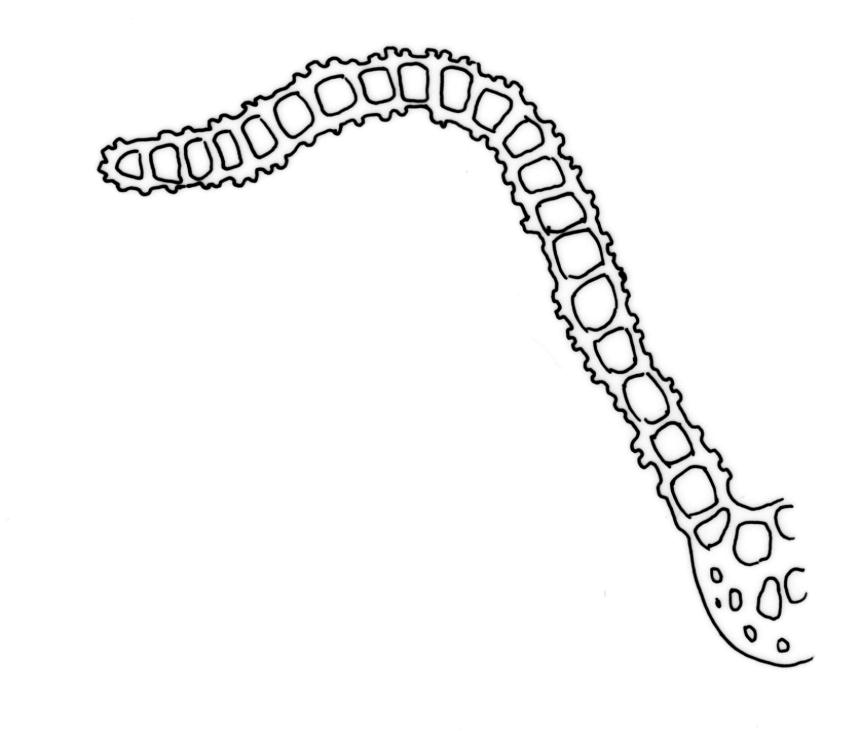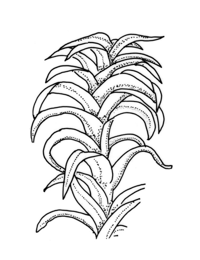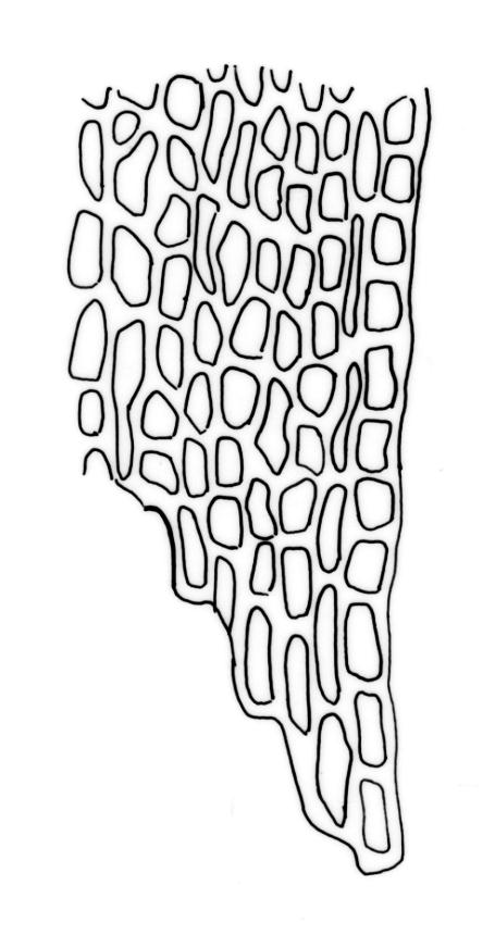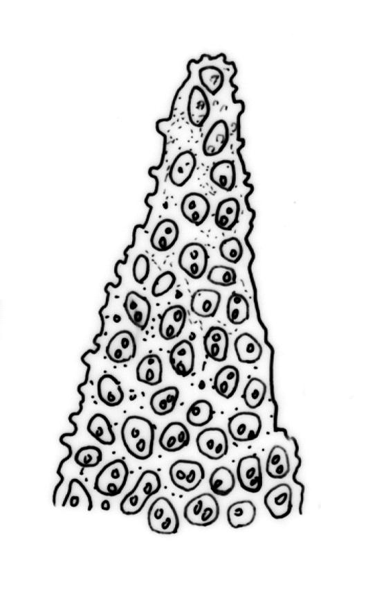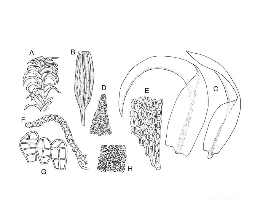 Plants medium-sized to robust, yellow-green above, red-brown below. Stems unbranched or sparsely branched (apparently by innovation, but perhaps also by forking), mostly c. 7–20 mm., in cross-section with small incrassate cortical cells, thick-walled internal cells, and lacking a central strand; rhizoids well-developed, numerous on lower stems, sometimes extending nearly to stem apex, brown, finely papillose. Leaves loosely erect-contorted (not secund) when dry, strongly spreading-squarrose when moist, weakly or not undulate, lanceolate to ovate lanceolate, acute or acuminate, somewhat decurrent, c. 1.4–2.0 × 0.3–0.4 mm (longer leaves near stem apex); margins plane, entire (except for projecting papillae); upper laminal cells irregularly rounded, almost isodiametric (but shape obscured by papillae), not differentiated at margins, with 3–5 short, single papillae on both surfaces, 6–9.5 µm diam.; apical cells sometimes hyaline and smooth; basal cells rectangular or rhomboidal, moderately thick-walled, smooth, sometimes red-brown, grading abruptly into the papillose cells above. Costa stout, c. 35–45 μm wide in lower leaf, yellow-brown, ending below the apex, with cells on both surfaces elongate, weakly papillose abaxially in upper half. Gemmae borne in clusters on axillary stalks, broadly ovoid, mostly 54–70 × 30–35 μm, 5–6-celled, with two transverse and 1–2 longitudinal walls. Laminal KOH colour reaction positive red or yellow then red (also in costa and stem).