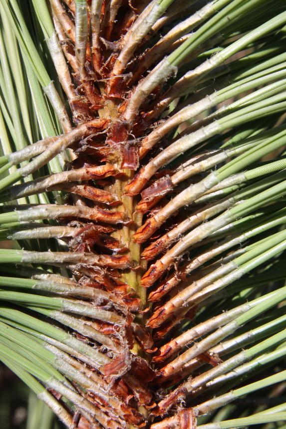 - its needle-like leaves (up to 26 cm long) are rigid, pungent, dull green, and arranged in groups of two.
