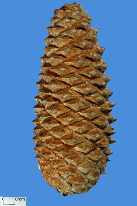 - the mature female cones are long-persistent, more-or-less symmetrical, 7-15 cm long, and sessile or with a short stalk.
