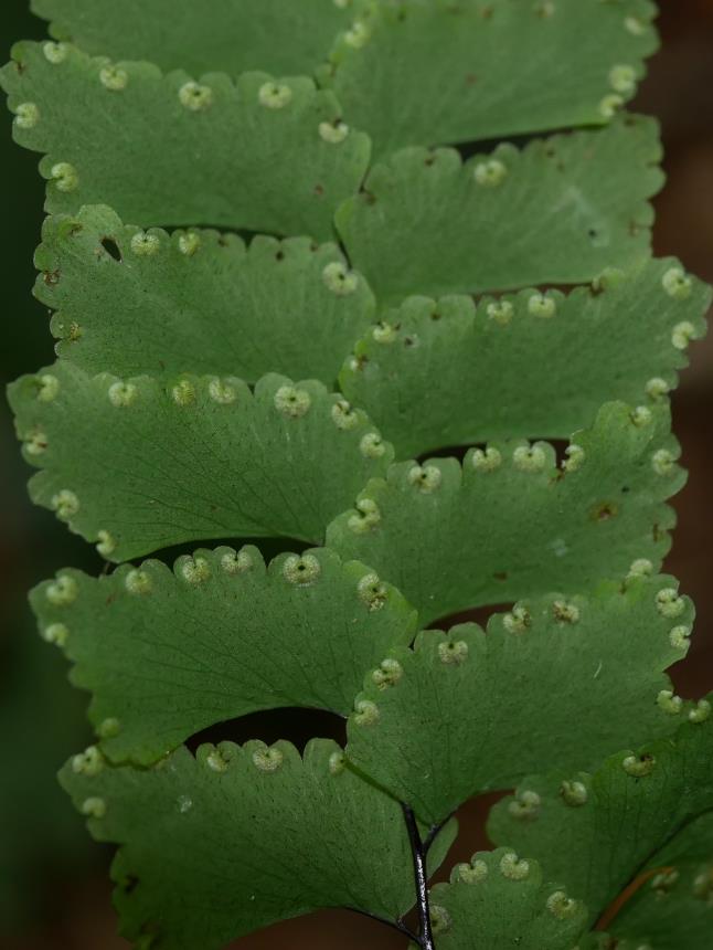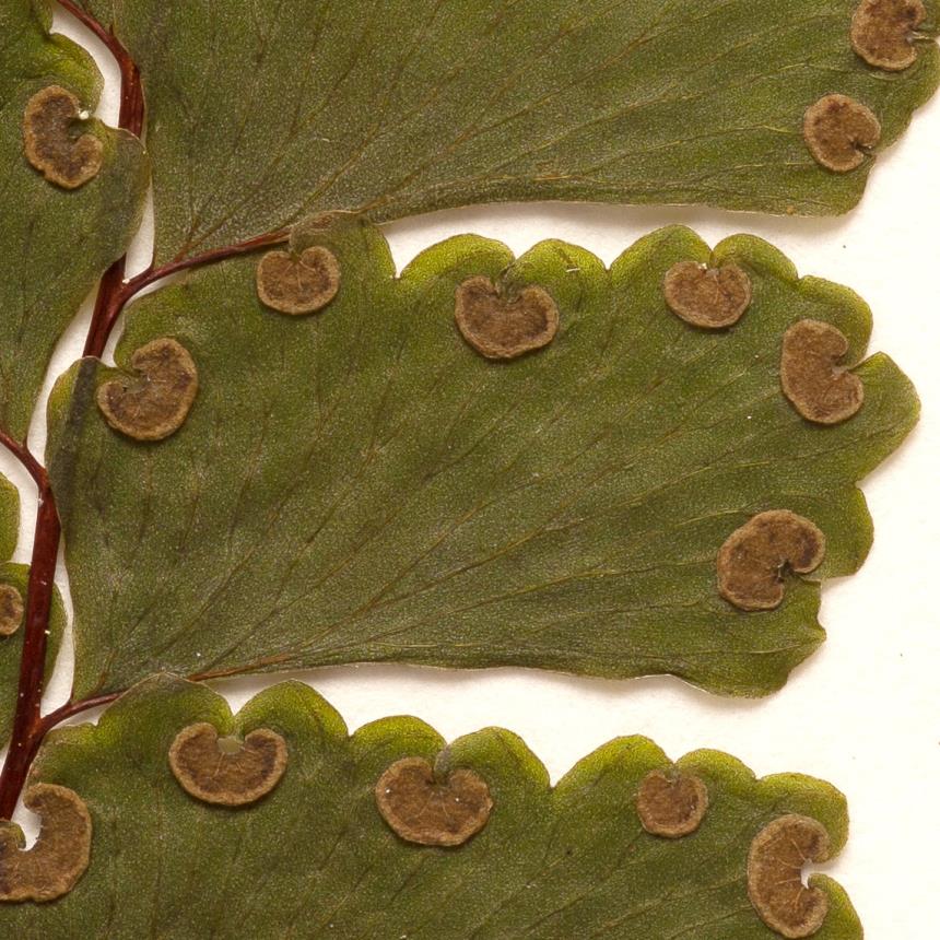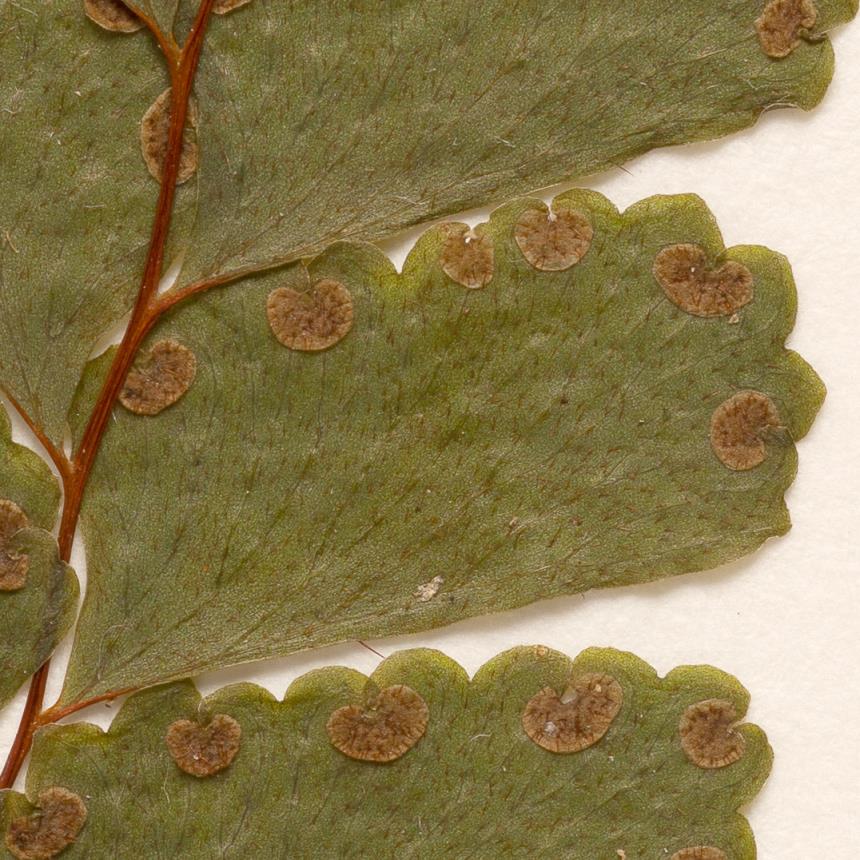 Brownsey et al. (2019) found that, among collections held at WELT, 57% had hairs on the abaxial lamina surfaces and 43% were glabrous or nearly so. Glabrous and hairy plants were sometimes found in the same population. In his original description of A. diaphanum, Blume (1828) noted that the pinnae were glabrous. Price (1990) further noted that “all plants from Java, the source of Blume’s type of A. diaphanum, have glabrous indusia”, whereas plants from the Philippines had setulose indusia and hairy pinnae. He suggested that the hairy plants corresponded to A. setulosum, described by Smith (1846) from Norfolk Island. However, Bostock (1992) rejected this conclusion. He noted that all 16 separate plants on three type sheets of A. diaphanum at L had at least some hairs on the laminae and “indusia”. He noted that there was “no justification whatsoever for using the name A. diaphanum Blume solely for plants with glabrous soral flaps”. He included Adiantum setulosum J.Sm. in the synonymy of A. diaphanum, a decision also followed here.