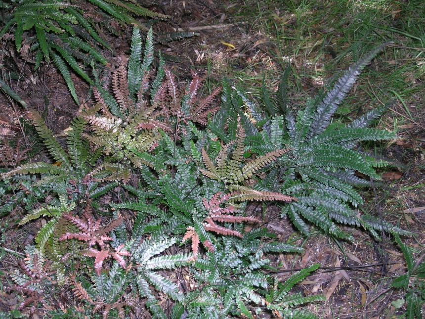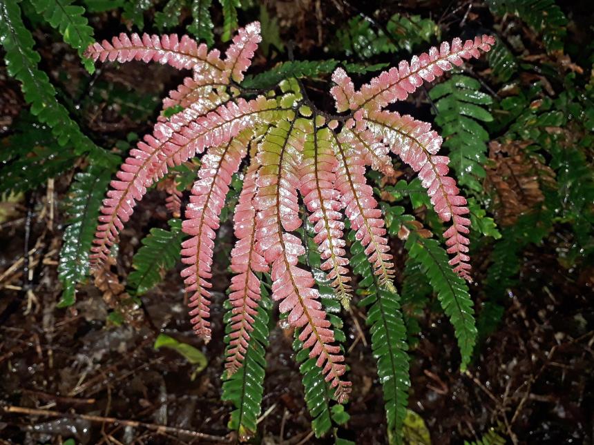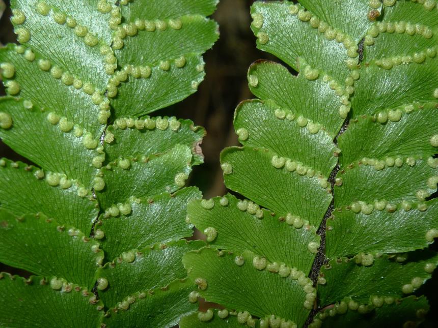Adiantum hispidulum can usually be distinguished from all other maidenhair ferns in New Zealand by its characteristic helicoid branching. A few plants are regularly 2–3-pinnate, and these may be confused with divided forms of A. diaphanum, but they can be distinguished by their more divided laminae and lack of tubers on the rootlets. Young fronds are also often tinged red when young.