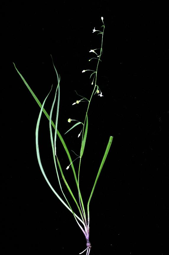 Delicate summergreen plants forming small colonies; a conical tuber c. 10 × 6 mm. forms at the base of each annual shoot, sts connected to that of the previous year by a slender rhizome up to 10 cm. long. Lvs c. 10–30 cm. × 3–10 mm., linear, ± flaccid; midrib and nerves inconspicuous; sheath membr. Infl. us. exceeding lvs; peduncle very slender, often < panicle; panicle narrow, either simple and raceme-like or with a few slender laterals; main bracts lflike. Fls solitary or in uneven-aged groups of 2–3; pedicels 1–2 cm. long, pale above the joint. Per. c. 1 cm. diam., white; tepals acute, subequal or the outer slightly broader. Stamens much < tepals; anther-tails almost wholly adnate to filament, white. Capsule c. 3 × 3.5 mm., sulcate; valves keeled and shortly horned towards base. Seeds c. 6 in each locule, to 1.4 mm. long, black with a surface pattern of minute hexagons. n = 11.