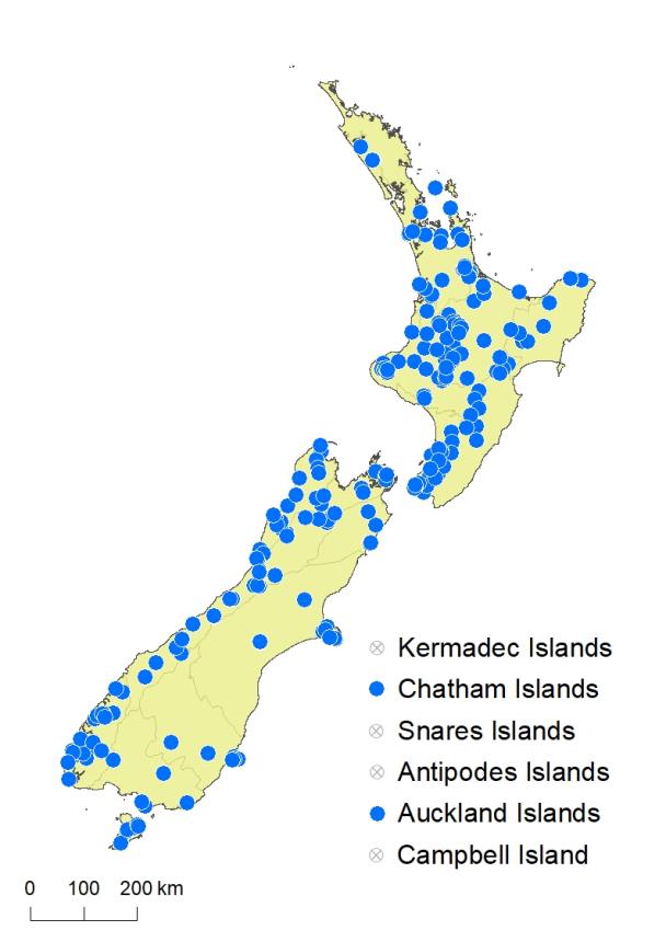 South Island: Western Nelson, Sounds-Nelson, Marlborough, Westland, Canterbury, Otago, Southland, Fiordland.