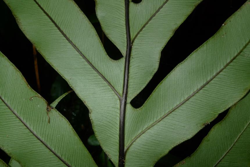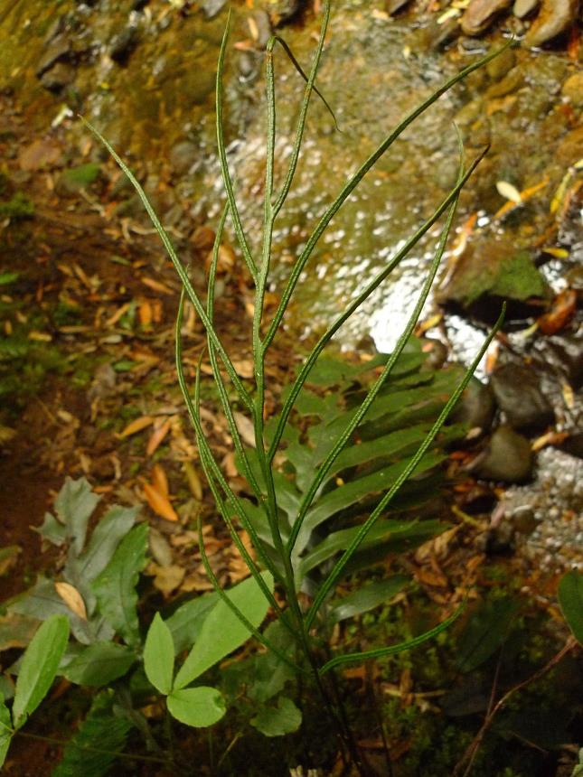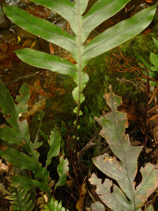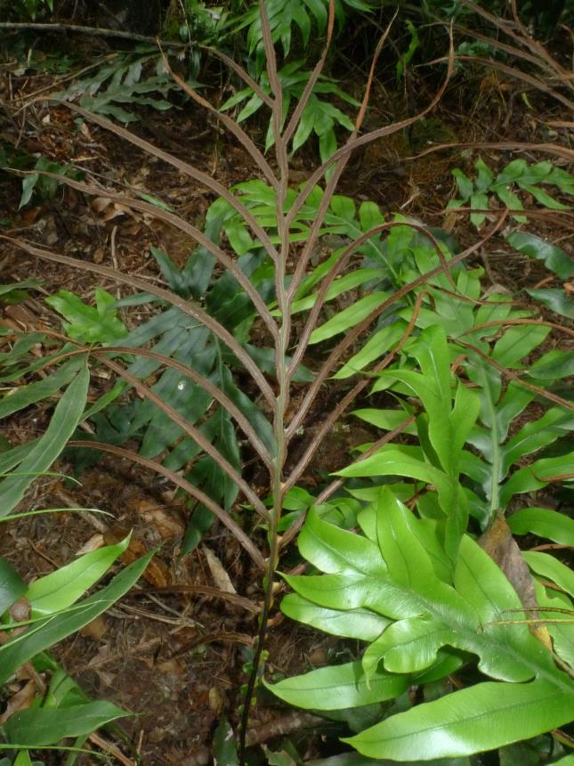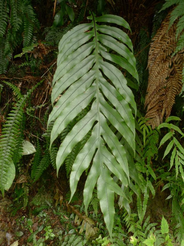 Rhizomes short-creeping, up to 250 mm long (in herbarium material), bearing scales. Rhizome scales ovate or triangular, 6–11 mm long, 1.5–4 mm wide, bicolorous with dark brown centres and chestnut-brown margins. Fronds strongly dimorphic; fertile and sterile fronds with similar habit, often hanging downwards; pinnatifid sterile fronds 225–1270 mm long; fertile fronds on same plant about the same length, 270–900 mm long. Sterile fronds. Stipes 30–220 mm long, red-brown, bearing a few scales proximally. Rachises red-brown abaxially, yellow-brown and grooved adaxially, glabrous. Laminae either entire, narrowly elliptic, 70–380 mm long, 25–60 mm wide, or pinnatifid to pinnatisect, obovate, 190–1000 mm long, 70–440 mm wide, dark green adaxially, paler green abaxially, coriaceous, glabrous. Pinnae in 1–11 large pairs below a large acuminate terminal segment, closely spaced, oblong or narrowly elliptic or narrowly obovate, straight, reducing abruptly to several additional pairs of tiny sterile flanges at the lamina base; the longest pinnae at or above the middle, 60–290 mm long, 15–45 mm wide, apices acuminate, margins entire, bases decurrent; the basal pinnae alternate. Veins free. Fertile fronds. Stipes 50–210 mm long. Laminae 200–740 mm long, 90–280 mm wide. Fertile pinnae in 2–10 large pairs, linear, straight, the longest 85–280 mm long, 2–6 mm wide, reducing abruptly to several additional pairs of tiny sterile flanges at the lamina base. Sori and indusia in one row either side of costa, continuous along the length of the pinna, sometimes with green lamina tissue at base of pinnae in largest fronds.