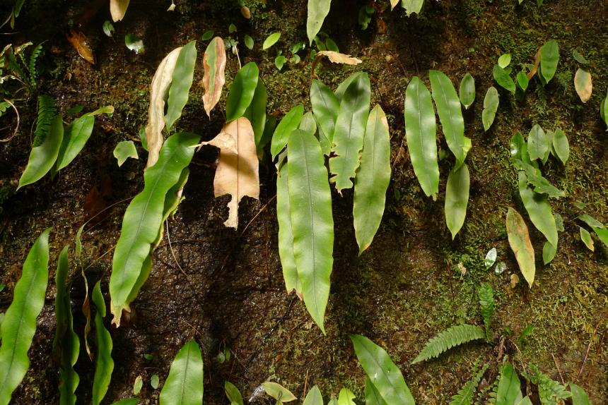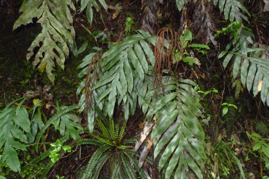 Blechnum colensoi is a terrestrial fern found under podocarp, broadleaved and beech forest, usually in damp, shaded habitats. It grows on rock walls, steep-sided gullies, stream banks, track banks, on the forest floor, and sometimes on shingle slips. It is frequently found hanging from steep banks close to waterfalls.