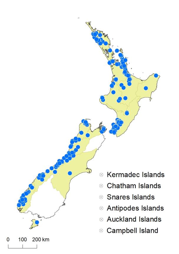 South Island: Western Nelson, Sounds-Nelson, Westland, Canterbury, Fiordland.