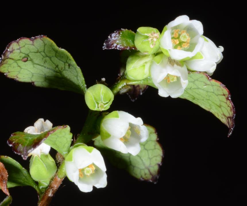 Mat-forming shrublet, usually < 10 cm tall; stems much-branched, ± interlacing, creeping and rooting; branchlets ± setose. Lvs alternate; petioles very short. Lamina usually 3–12 × 3–9 mm, elliptic, broadly elliptic to orbicular (the different forms sometimes all present on one plant), coriaceous; margins crenate to crenulate, sometimes entire, setose or glabrous; base cuneate to rounded; apex rounded, mucronulate or ± acute. Fls solitary in axils of uppermost lvs, subsessile; bracteoles 1–1.5 mm long, very broadly ovate. Calyx lobes 1.5–2 mm long, ovate-triangular, acute or subacute. Corolla ± urceolate; tube 1.5–2 mm long; lobes ± ovate, obtuse. Fr. 8–12 mm diam.; fruiting calyx fleshy, white, pink or red.