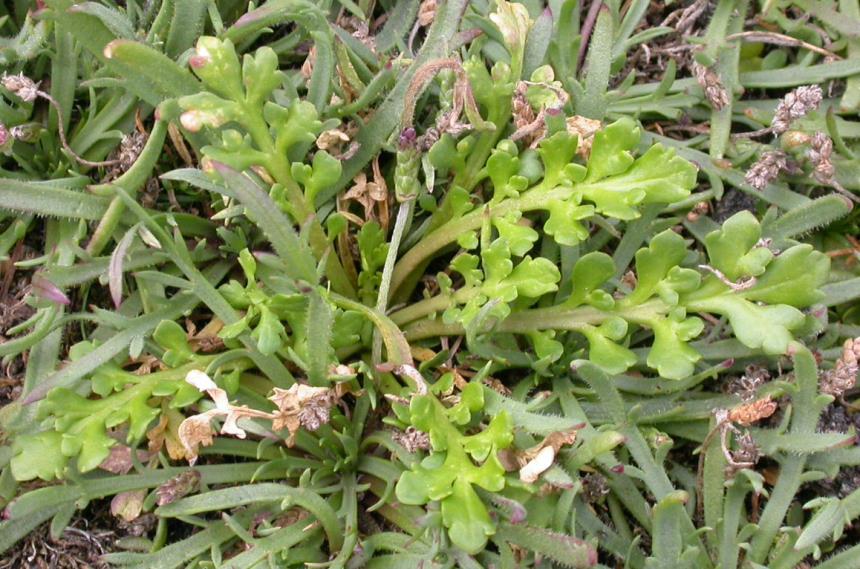 Perennial herb. Stems prostrate to decumbent, 10- 25(-40) cm long, finely puberulent with short papillate or tapered hairs. Leaves fleshy, dull green. Basal and lower cauline leaves withering at fruiting, glabrous above, with papillae or denticles along midrib beneath and margins, pinnatifid, obovate to oblanceolate, 5-7 × 1.5-2.5 cm; pinnae in 1-3 pairs, bluntly toothed or crenate at apex and distal margins. Cauline leaves obovate, oblanceolate, or spathulate, bluntly toothed to crenate distally, cuneate at base, 10-25(-30) × 5-10 mm, with triangular denticles dense on margins and sparse to dense beneath, glabrous above. Racemes 15-40(-50) mm long, terminal and leaf-opposed; rachis and pedicels puberulent with short tapering hairs, or glabrous; pedicels erecto-patent, 3-4 mm long at fruiting. Flowers c. 2 mm diameter. Sepals glabrous or sparsely hairy, green with scarious margins, c. 1 × 1 mm. Petals white, about equalling sepals, erect, not clawed, narrow-obovate to narrow-oblong, entire and rounded at apex. Stamens 2. Nectaries 4, very small; nectar slight. Siliques broadly elliptic to broadly ovate, (3.2-)3.5-3.8 × 2.2-2.5(-2.8) mm; style 0.1- 0.2 mm long, free from the narrow rounded wing, shorter than the notch; stigma 0.3 mm diam.; valves glabrous. Seed broadly obovoid, brown, not winged, 1.6-2 mm, mucilaginous when wet. FL Oct-Jan, FR Dec-Apr.