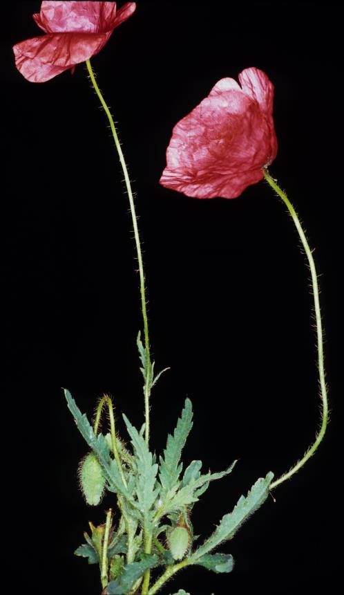 Annual herb; rosette tufted; stems erect, usually sparsely hispid, 30–60–(100) cm tall. Lvs dull green, 7–20 × 1–8 cm, at least the lower petiolate. Lamina narrow-ovate to triangular, cuneate at base, sparsely to densely hispid, pinnatifid to 2-pinnatisect, the upper becoming less divided. Pedicels to 30 cm long, with fine spreading hairs throughout. Sepals hispid, 10–20 × 5–10 mm. Petals red, rarely pink or white, 2–4 × 2.5–6 cm, usually with dark, sometimes white, basal blotch. Capsule subglobose to broadly obovoid, widest above 1/2 way, flat-topped, rounded at shortly stipitate base, slightly ribbed, glabrous, 10–15–(20) × 8–15 mm. Stigmatic disc = width of capsule, flat when ripe; rays (5)–8–12–(18).