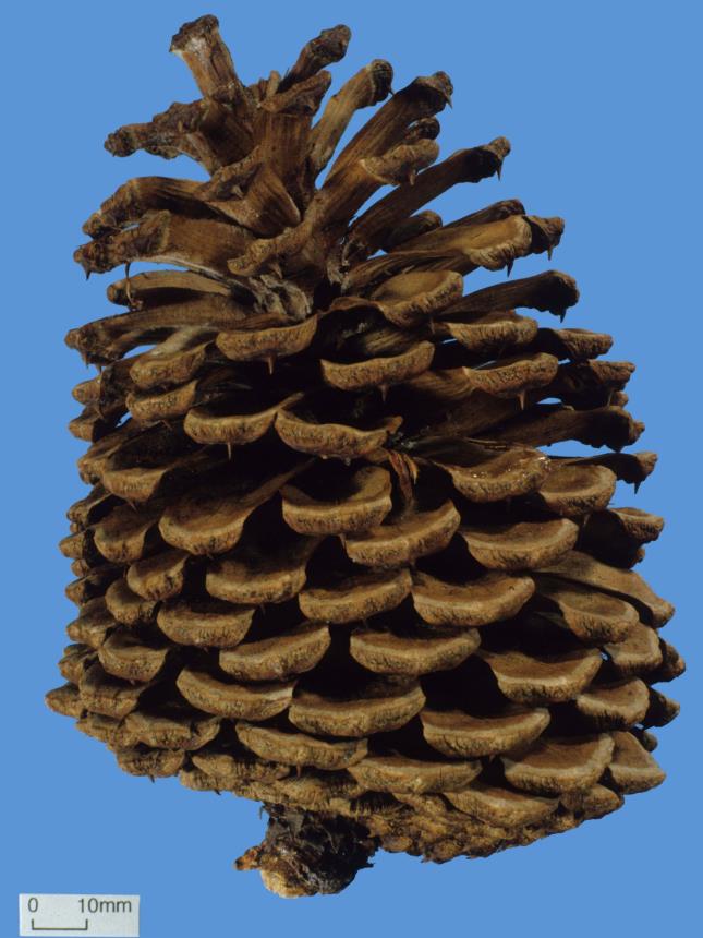 Medium-sized to large, open tree (over 30 m high in cultivation). Bark thick, fissured, reddish brown beneath. Shoots brown or brownish green, glabrous, shining. Buds ovoid or cylindric-ovoid, sometimes large, slightly resinous; scales fimbriate, often dark, free towards apex. Foliage in dense terminal clusters in mature trees, dull green. Lvs 3–(4) per fascicle, 10–23–(27) cm × 1.3–1.6–(2) mm, rigid; resin canals median; sheaths prominent, > 2 cm long when young, 5–20 mm long around older lf bases. ♂ strobili mostly 1.5–2 cm long, broad-cylindric. Conelets sessile; scales aristate. Mature open cones sessile, ± pendent, 6–14–(18) × 5–10 cm, ovoid-oblong before dehiscence, symmetric, shining brown, deciduous and dehiscent at or soon after maturity but leaving basal scales; apophyses flattened or slightly concave; umbo with prickle deflexed at maturity. Seed wing 1.5–2.5 cm long, large, broad, asymmetric.