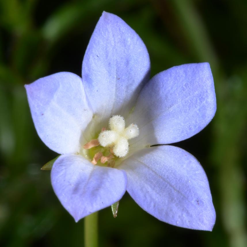 Characters of the radicate group. Short-lived perennials with lifespan about 2 years. Root branching, fleshy, brittle. Stems 10—150 cm tall, fleshy and brittle in life, juveniles with opposite leaves, adult plants with mostly alternate sessile leaves, some stems and laterals with lower leaves opposite. Branches often closely divaricating, young shoots hairy, with crowded leaves. Leaves usually elliptic to oblanceolate, 10-40 × 5-10 mm, regularly and closely serrate, glabrous, bright green, fleshy and glossy as if varnished (in life), sparsely hairy, with prominent midrib below; sometimes linear, entire. Flowers in different populations may be white, pastel lilac (HCC 437/1), or flax blue (HCC 642/2), on short slender pedicels 2—7 cm long. Corolla campanulate, (10—)12—15(—20) mm diam., 9—12 mm long, tube cylindrical (cup-shaped), 2 × 2 to 4 × 4 mm, lobes 5 × 4 to 8 × 5 mm, oblong, subacute, spreading; style protruding slightly from tube, slightly thickened in upper half, white. Stigmas 3 or 4, small. Calyx lobes glabrous, 3 × 1 to 4 × 1.5 mm, narrowly triangular, becoming radiate or recurved in fruit. Capsule glabrous, obconic, 6 × 4 to 10 × 5 mm, flat-topped or slightly concave at the top, valves flat until ripe. Self-fertile. Seeds 0.5 mm long. FL Oct- May, FR Nov—May.